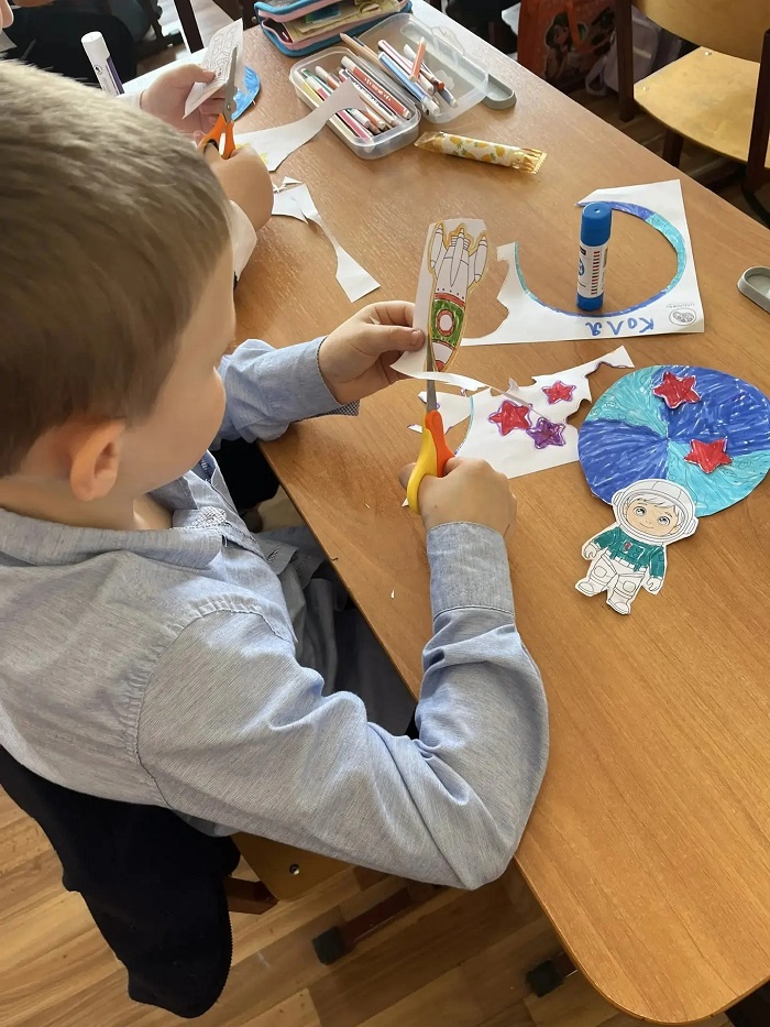А далее ребята погрузились в мир творчества, им предстояло с цветной бумаги и клея изготовить космическую орбиту. Вырезали шаблоны планет, дорисовывали карандашами, а затем закрепляли их на своей орбите. Спасибо за содействие в проведении мастер класса учителю Татаркиной Ларисе Николаевне.